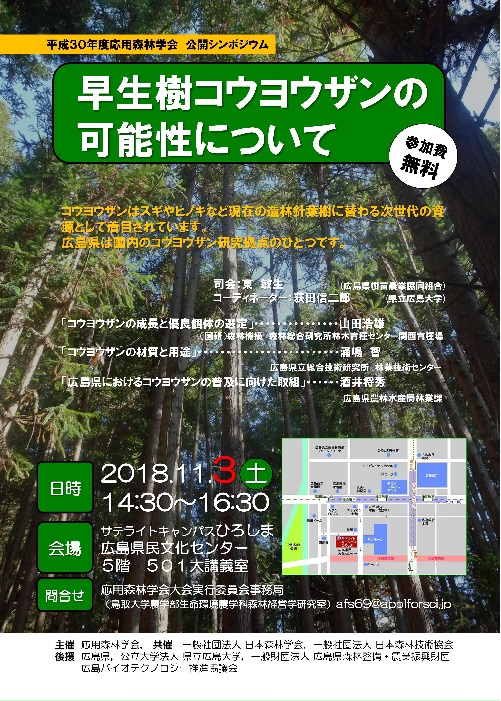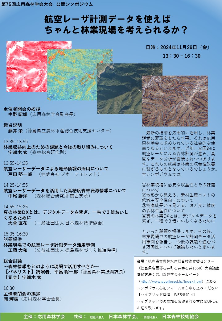 - 第75回応用森林学会大会(徳島)の日程をお知らせします。2024年11月29日(金)〜30日(土)に徳島県立農林水産総合技術支援センターにて開催際します。詳細に関しては随時お知らせします。