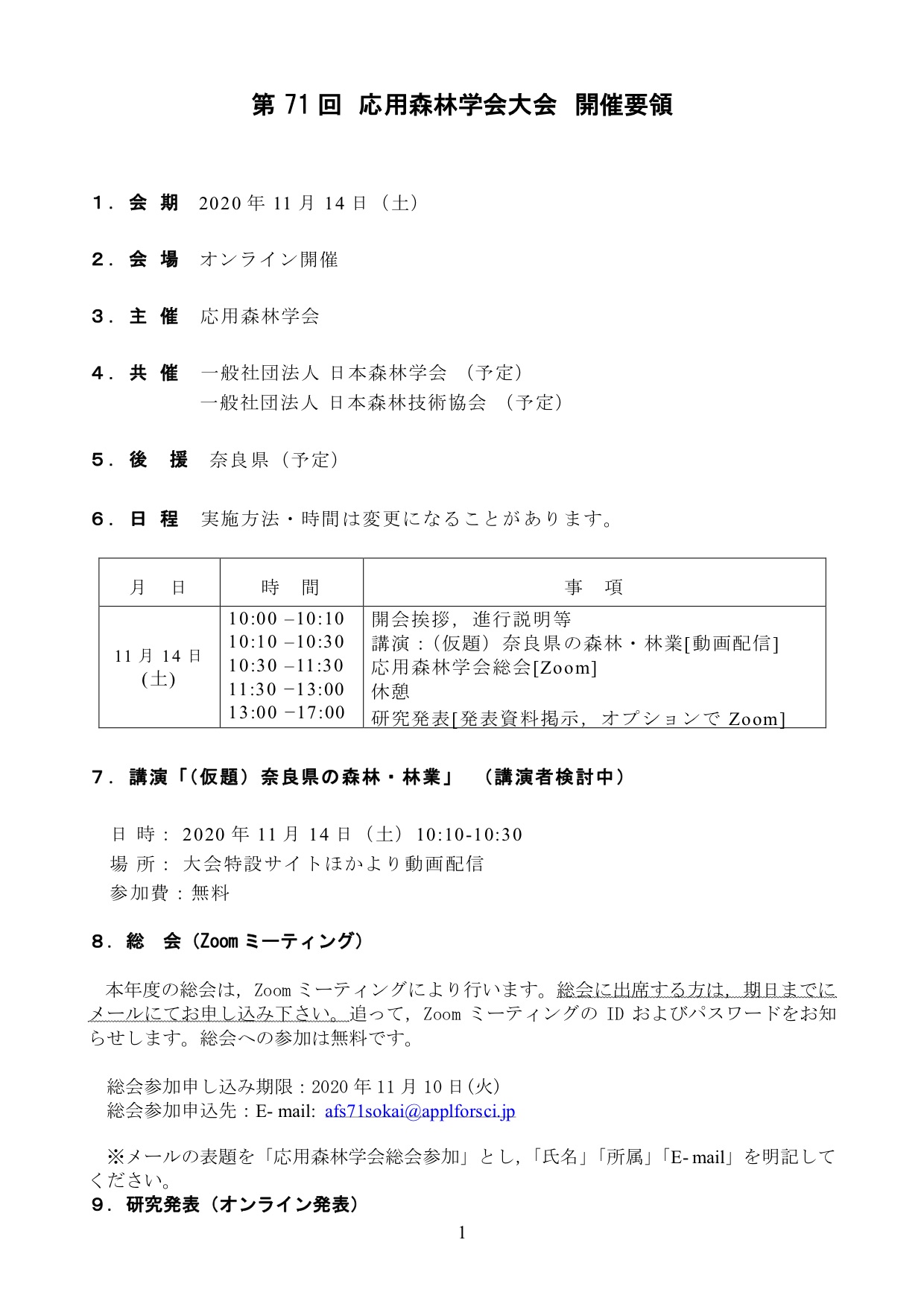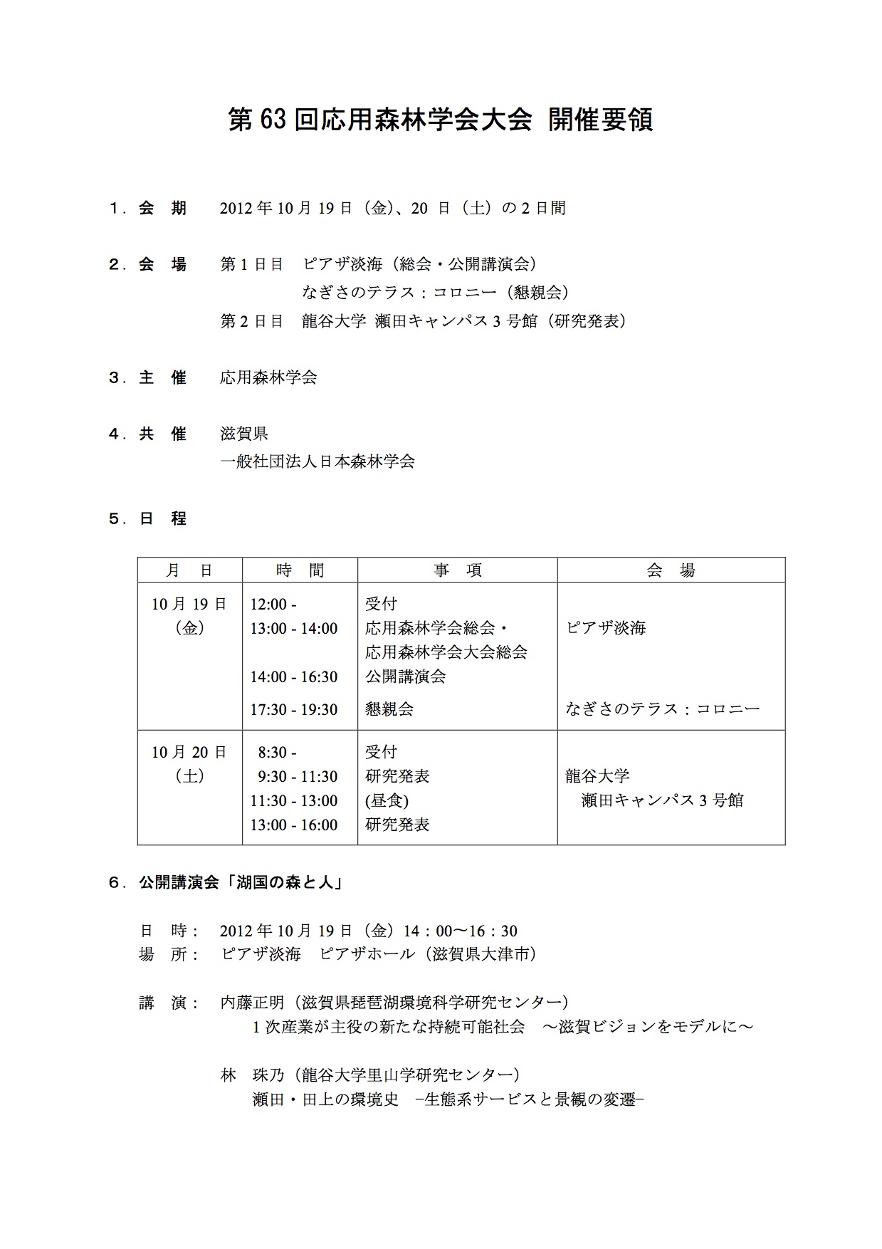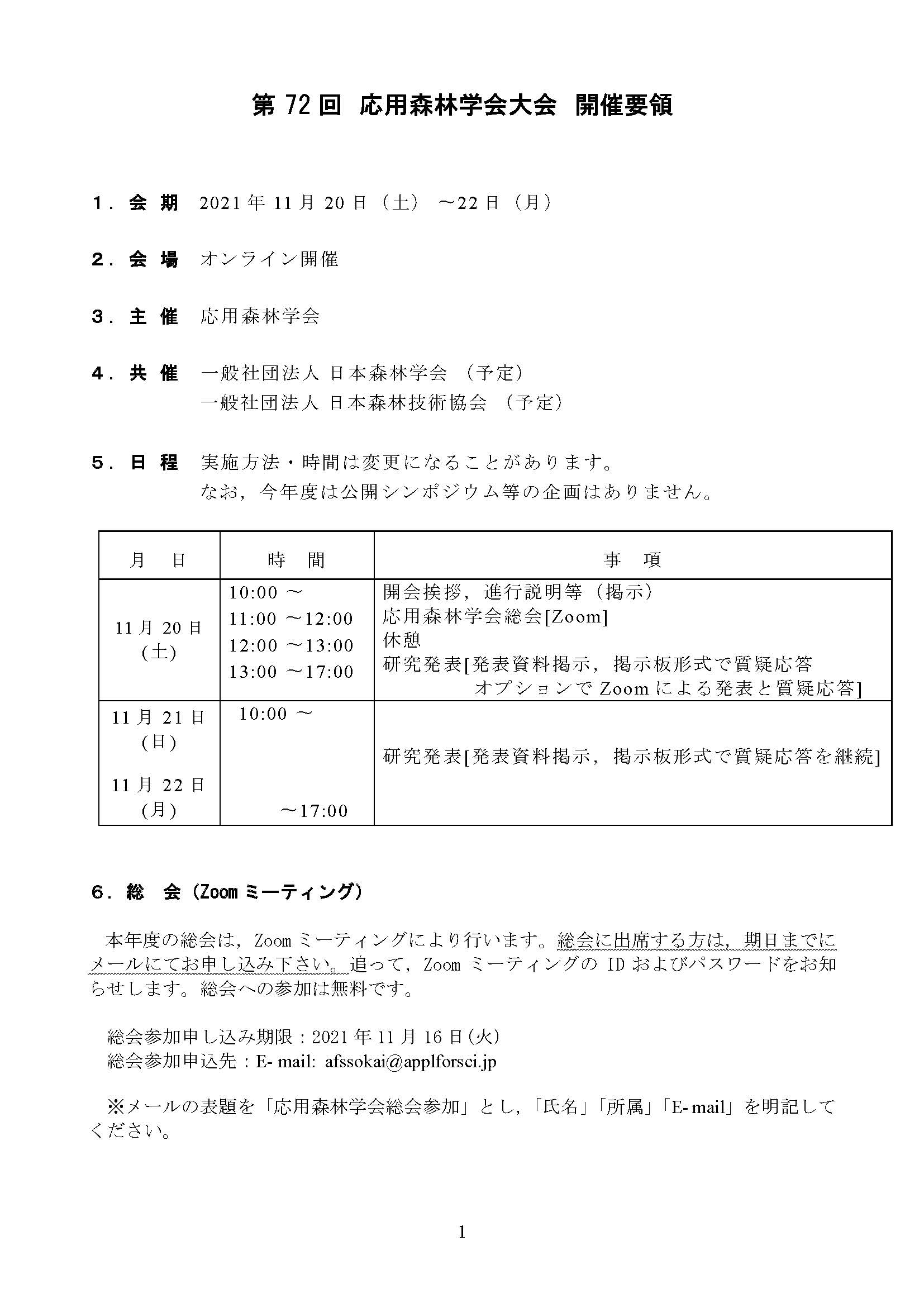 - NEW!! 第76回応用森林学会大会(島根)の開催要領を公開しました。参加・研究発表する会員は,2025年11月4日(火)までに参加・発表申込フォームよりお申し込みください。発表要旨(様式はこちら)を作成のうえ,同じく11月4日(火)までに大会事務局(afsmeeting@applforsci.jp)に提出してください。皆様の研究発表申込をお待ちしています!!