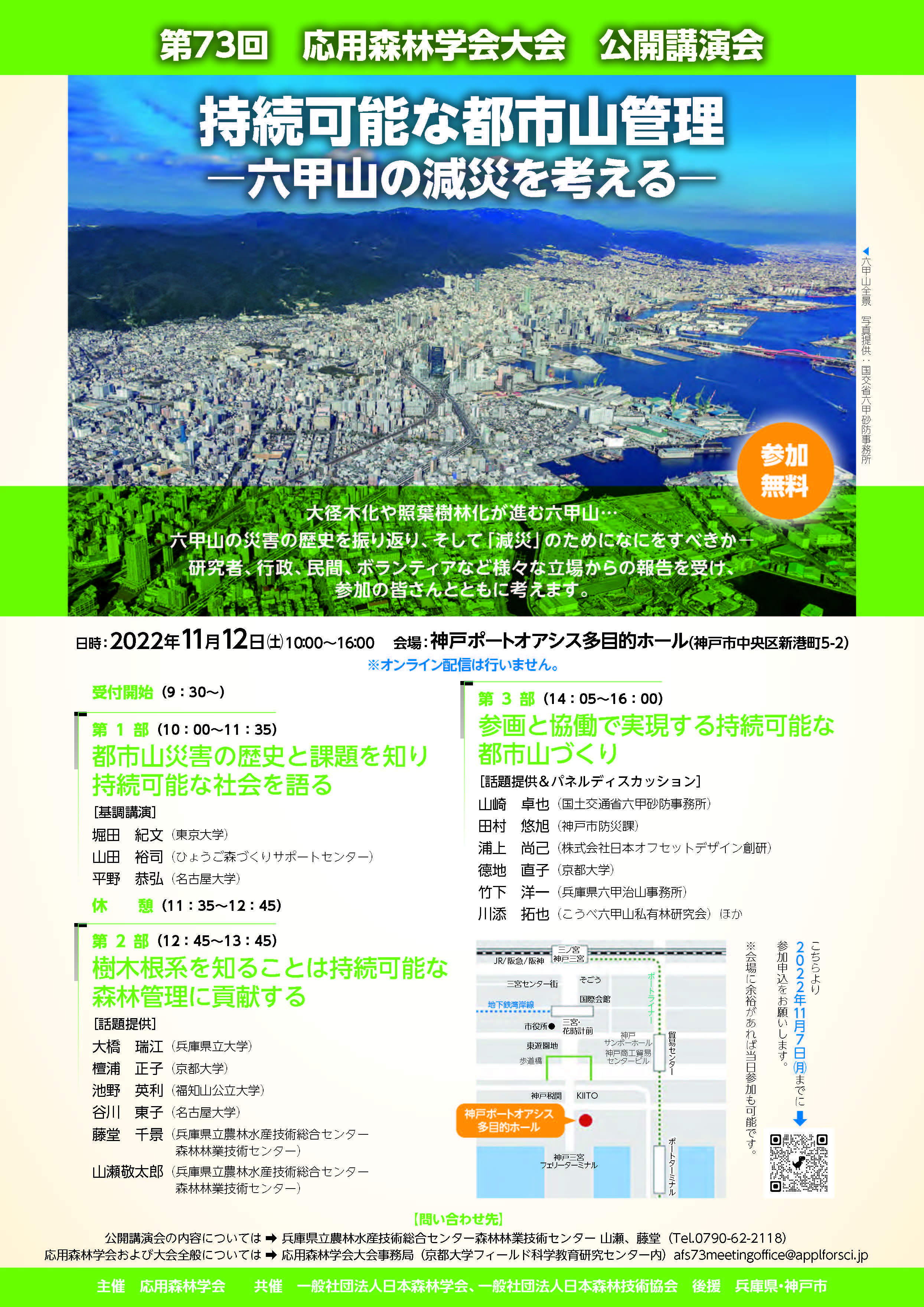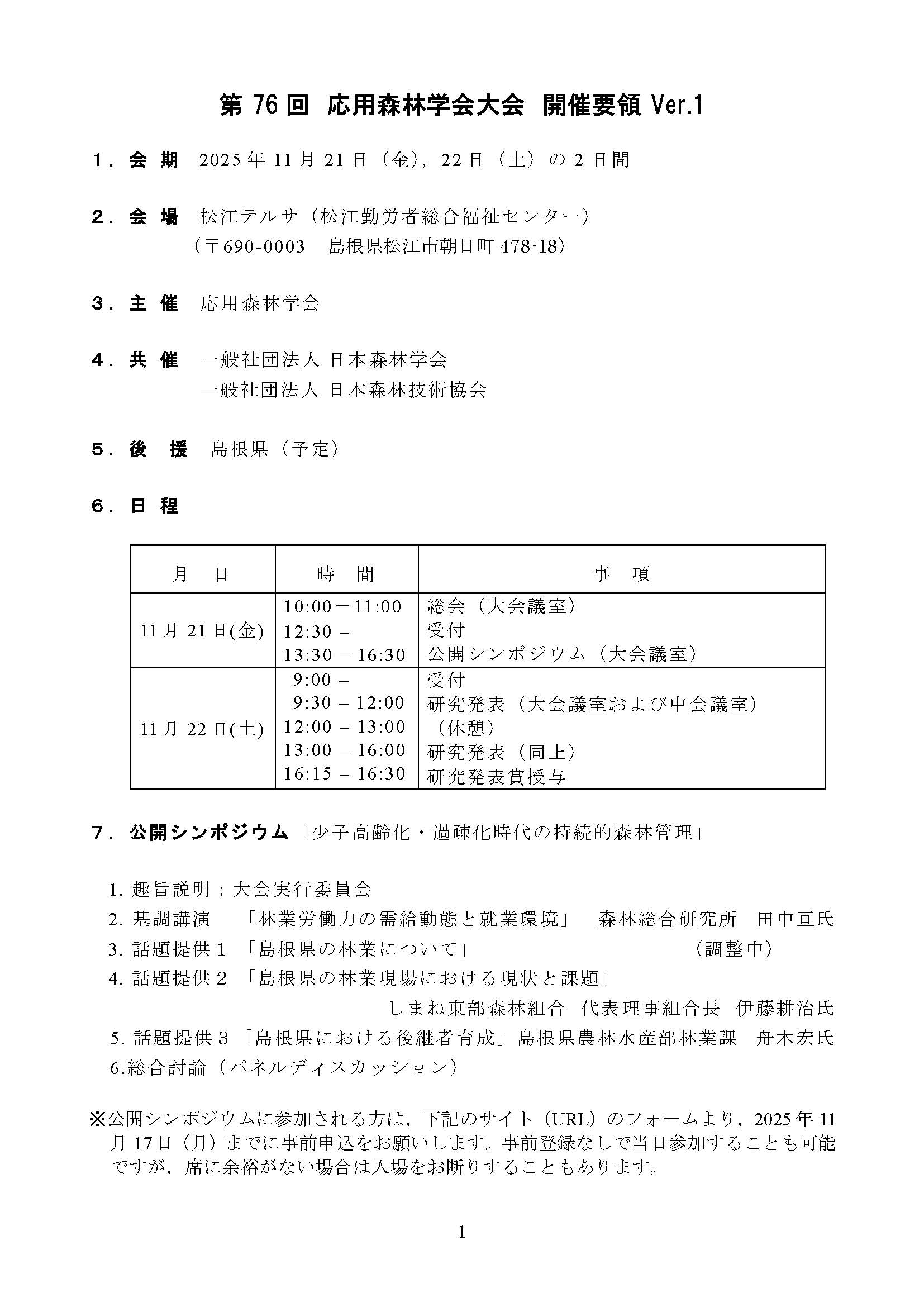- NEW!! 公開シンポジウム「少子高齢化・過疎化時代の持続的森林管理」(2025年11月21日(金)開催)の参加受付中です。公開シンポジウムは学会員でない方も参加できます。登録サイトにアクセスし必要事項を記入し,2025(令和7)年11月17日(月)までに登録してください。